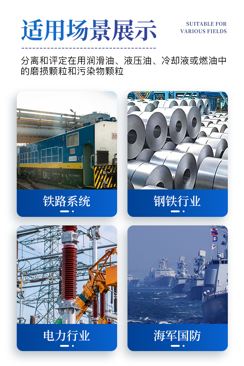 (14)应用范围:用以分离和评定在用润滑油、液压油、冷却液或燃油中的磨损颗粒和污染物颗粒;