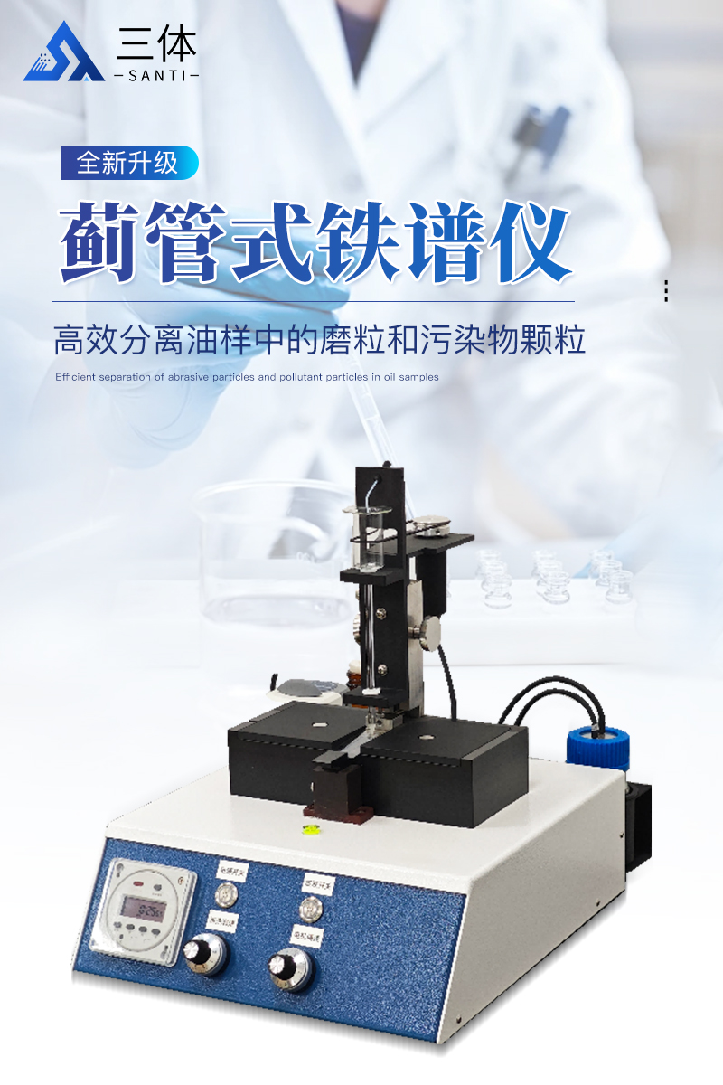 蓟管式铁谱仪是一套完整的铁谱分析系统,用以分离和评定在用润滑油、液压油、冷却液或燃油中的磨损颗粒和污染物颗粒,由蓟管式铁谱仪、显微镜、工业摄像头、加热盘(可选)和图像采集软件组成。为了确保谱片的制作质量,经稀释处理后的被测油液在自身重力作用下直接通过蓟型管,匀速流过铁谱谱片,油液中铁磁性颗粒在磁场作用下被沉积到谱片上,有效避免了制谱过程中外界作用力对磨粒造成的破损、变形等伤害;通过控制清洗剂的流量和流速,对谱片进行彻底冲洗;谱片干燥后进行分析。将制备好的谱片平稳的放在显微镜的载样台,通过使用显微镜的透射光、反射光、偏振光、红绿光源以及谱片加热等分析手段,参照标准的磨粒图谱,对磨损颗粒进行深入分析。