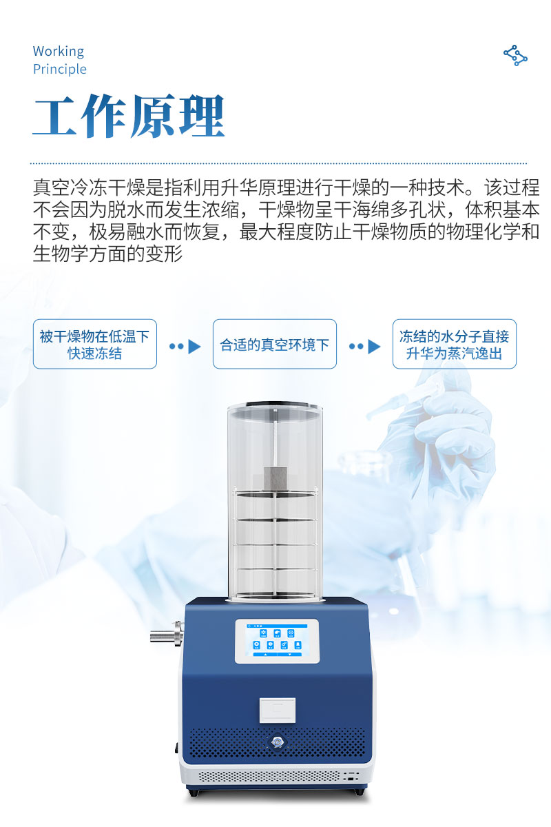 真空冷冻干燥是指利用升华原理进行干燥的一种技术,即被干燥物在低温下快速冻结,然后在合适的真空环境下,使冻结的水分子直接升华为蒸汽逸出。该过程不会因为脱水而发生浓缩,干燥物呈干海绵多孔状,体积基本不变,极易融水而恢复,**程度防止干燥物质的物理化学和生物学方面的变形。
