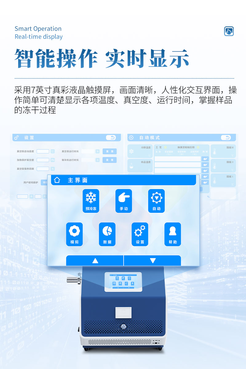 (2) 可清楚显示各项温度、真空度、运行时间,掌握样品的冻干过程。