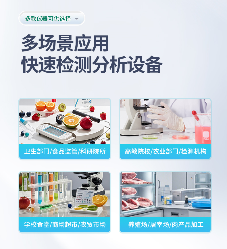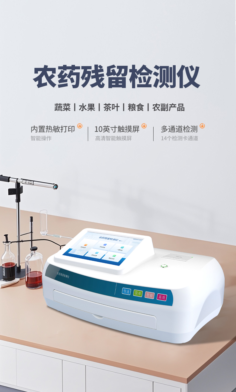 采用酶抑制率比色法对蔬菜、水果、茶叶、粮食、农副产品等食品中有机磷和氨基甲酸酯类农药残留含量进行快速准确的检测;广泛应用于果蔬茶生产基地和农贸批发销售市场现场检测、农业部门、学校食堂、市场监管局、检测中心等的安全速测。