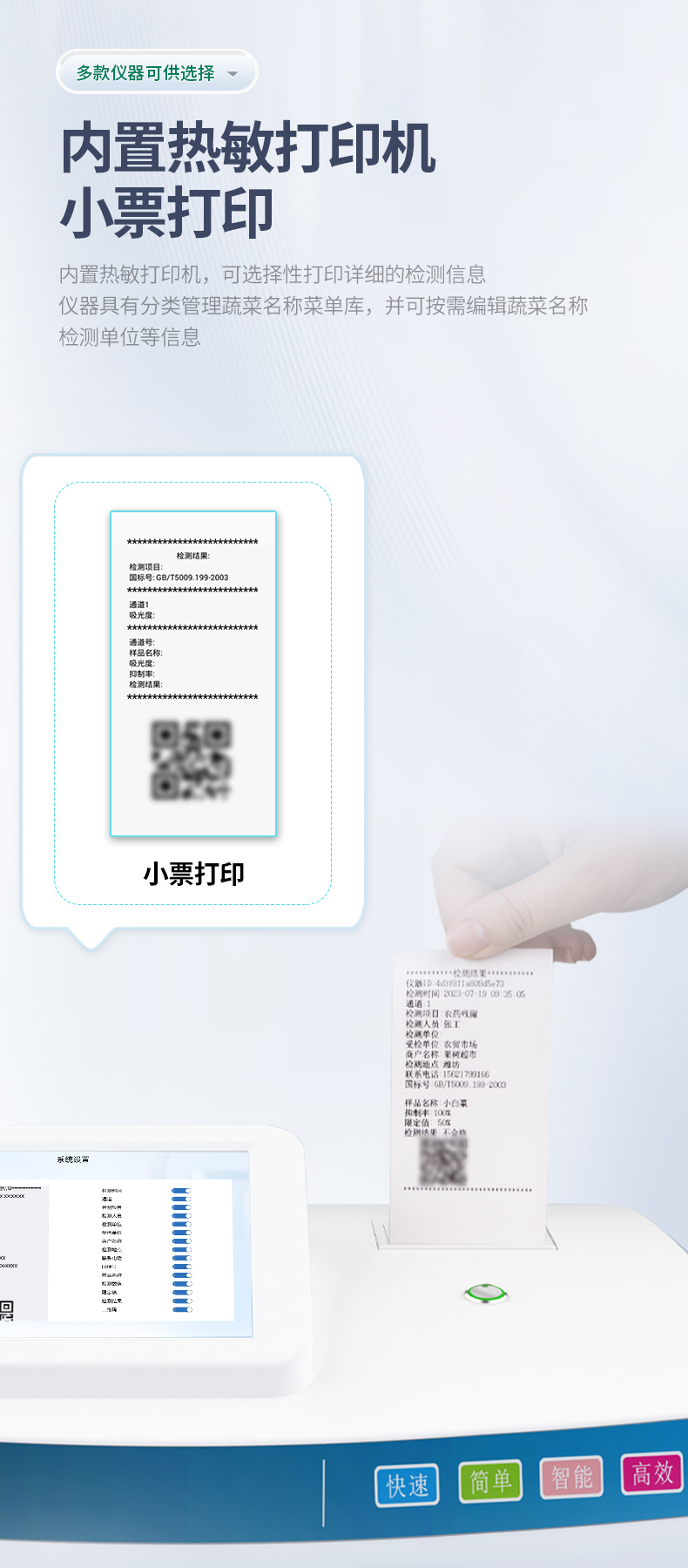 8、内置热敏打印机,可选择性打印详细的检测信息。