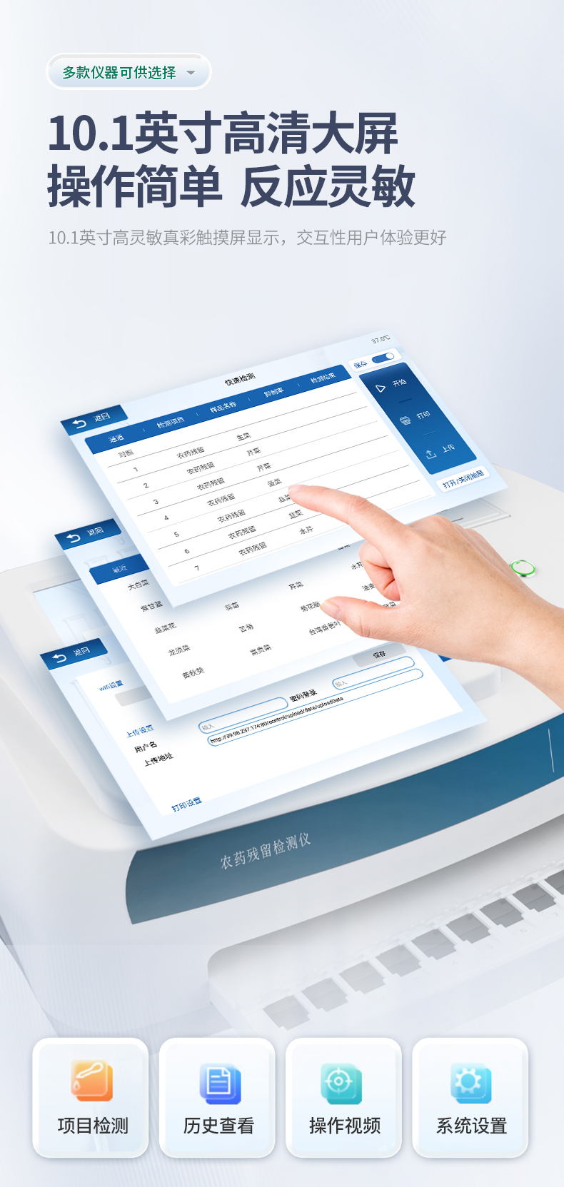 该仪器为三体仪器新研发一款农残快速检测仪,采用国标速测卡,使检测速度更快,操作更加简便。检测标准:依据国家标准方法(GB/T5009.199-2003)以及世界卫生组织WHO、世界粮农组织FAO残留农药检测标准、世界环境保护局EPA参照摄入量等要求来设计。