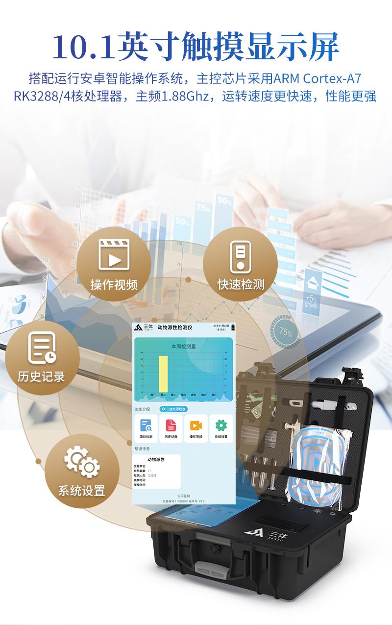1、仪器采用10.1英寸液晶触摸屏显,搭配运行安卓智能操作系统,主控芯片采用ARM Cortex-A7,RK3288/4核处理器,主频1.88Ghz,运转速度更快速,性能更强。