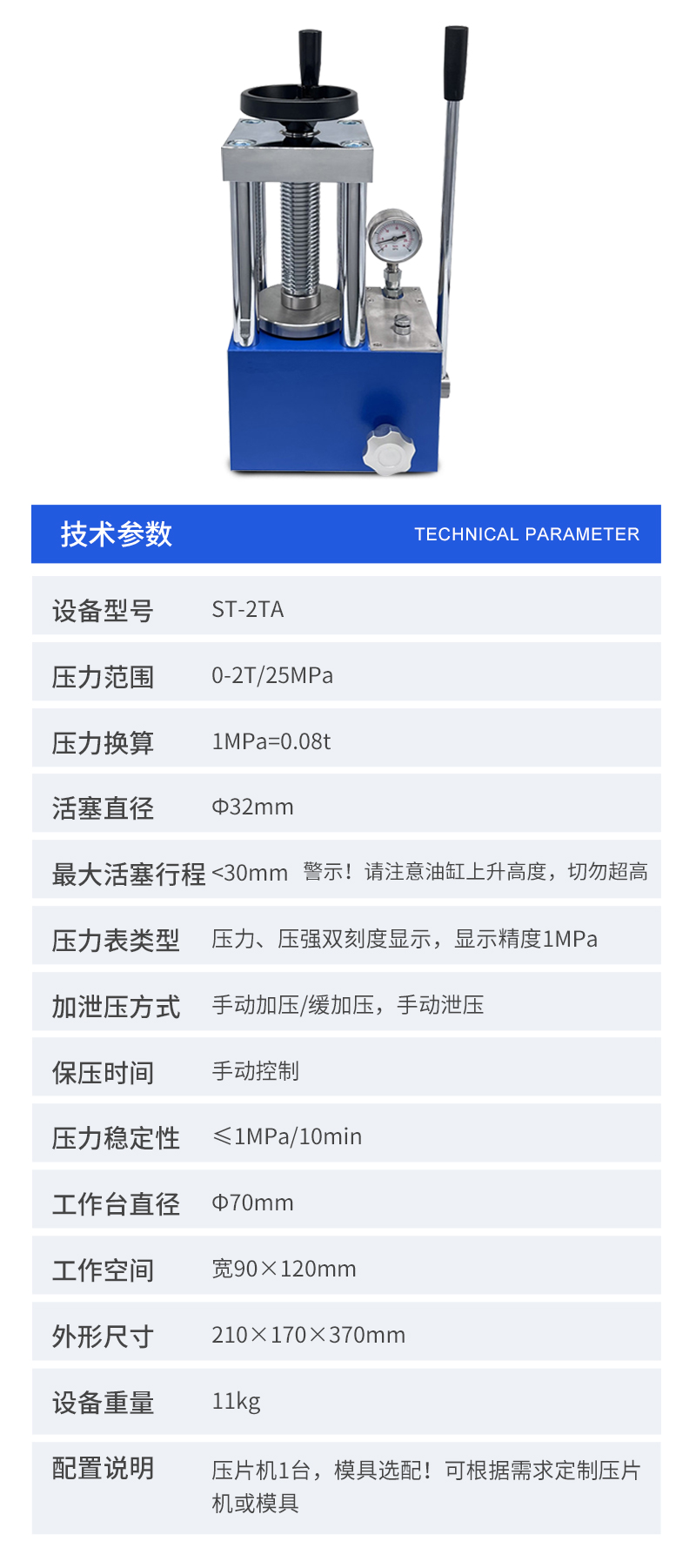 | 配置说明 | 压片机1台,模具选配,数显表选配!可根据需求定制压片机或模具 |