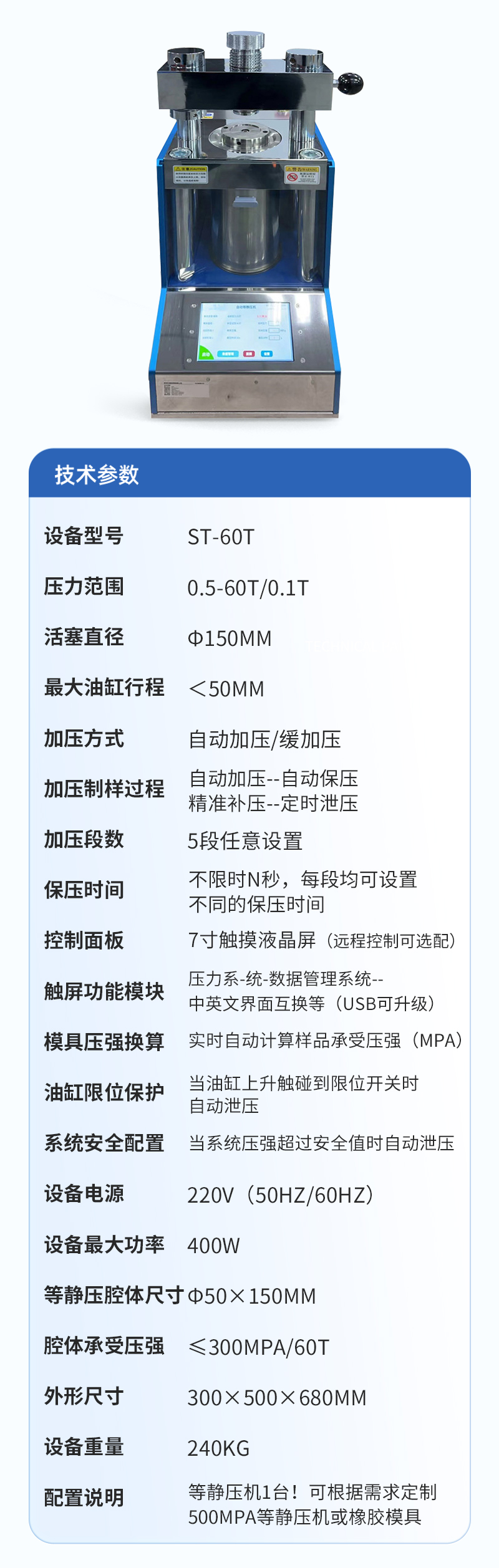 | 配置说明 | 等静压机1台!可根据需求定制500MPa等静压机或橡胶模具 |